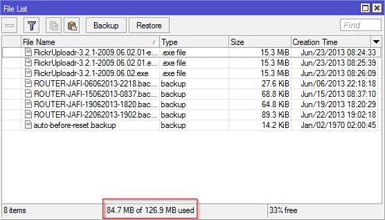 Ten router má uvnitř kromě RAM i 128MB disk. Tam je uložena konfigurace, skiny (úpravy uživatelského rozhraní), zálohy, ...