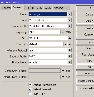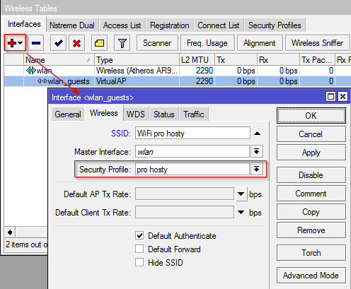 Na kartě Wireless na záložce Iterfaces přidáme nový Virtual AP (těch si mimochodem můžeme přidat tolik, kolik potřebujeme) a přiřadíme mu náš nový Security profile. Doporučuji vypnout volbu Default Forward, jednotliví účastníci pak na sebe neuvidí.