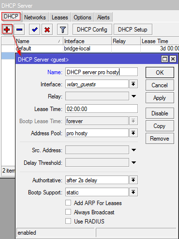Vše jsem udělal tak jak je popsáno a připojení mi fungovalo. Druhý den po zapnutí mi to přestalo fungovat a jediné co se změnilo, tak v IP / DHCP server se mi vytvořený DHCP server pro hosty zabarvil do červena. Zkoušel jsem ho odstranit a vytvořit znovu. Chová se to stejně. Už nevím v čem jsem udělal chybu.