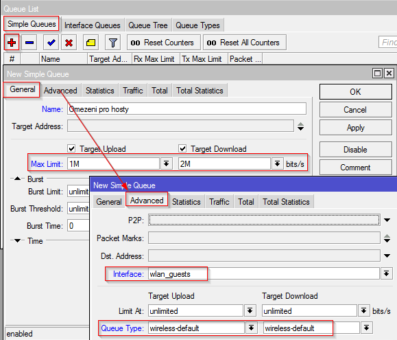 Omezení rychlosti na úrovni interface je velmi jednoduché. V našem příkladě nastavíme návštěvníkům limit 2Mbps download a 1Mbps upload.