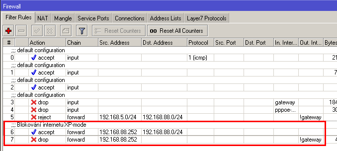 Půjdeme na kartu IP / Firewall, záložka Filter Rules