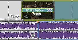 Pokud na časové ose částečně překryjeme dva klipy, dojde k lineárnímu prolnutí videa i zvuku. Čas v rámečku ukazuje dobu prolnutí.