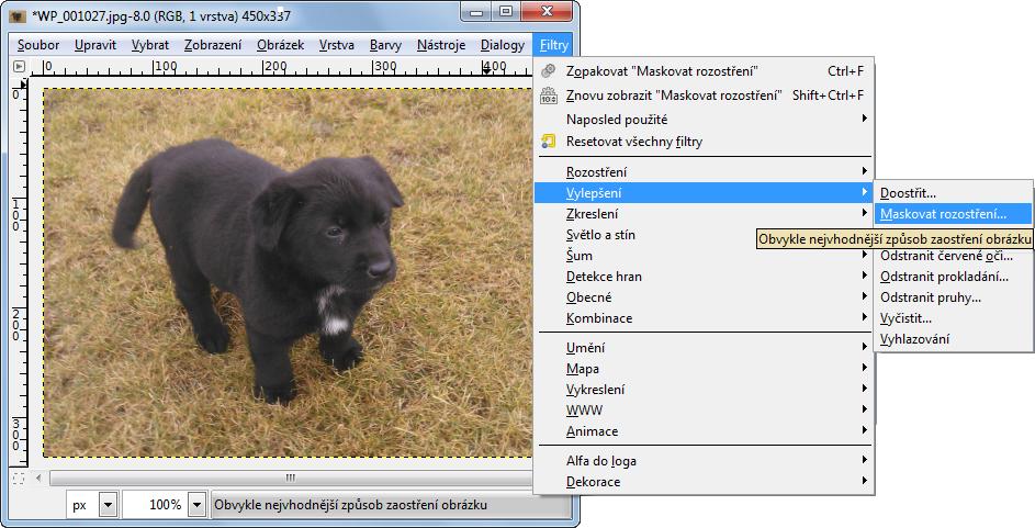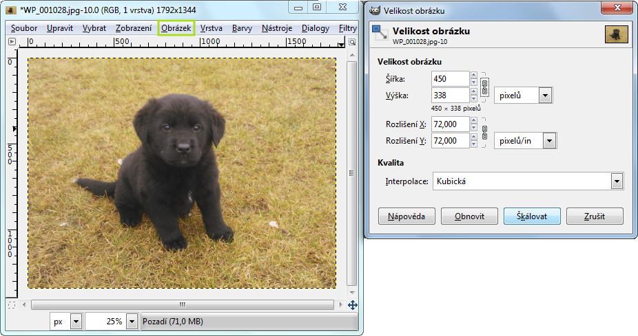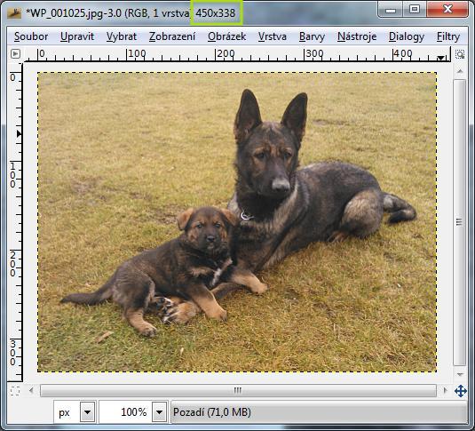 Otevřeme si první vhodný obrázek (např. u kterého zrovna není nutný výřez - anebo jej ořízneme podle návodu níže) a zvolíme si rozměry, na něž jej zmenšíme - zde 450 x 338 px. Docílíme toho postupem Obrázek -> Velikost obrázku...