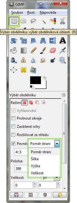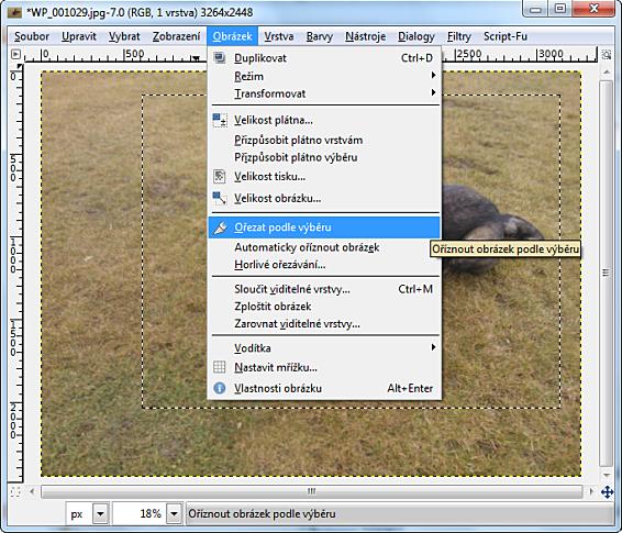 Další snímek si již o ořez říká, je zbytečné zobrazovat spoustu trávy :-). Nastavíme si u tlačítka Výběr obdélníku: výběr obdélníkové oblasti (R) poměr 4:3 (protože poměr rozměrů prvního obrázku 450:338 = 4:3).