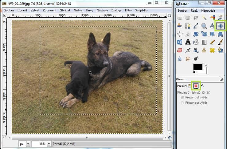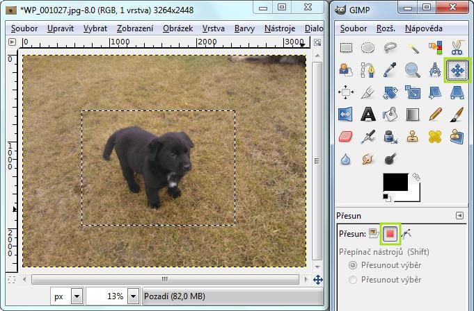 Nyní je stále možnost obdélníkem z "putujících mravenců" hýbat a nastavit jej přesně podle svých představ výsledného oříznutého obrázku. V poli vpravo od obrázku je zvýrazněno nastavení na pohyb výběru.
