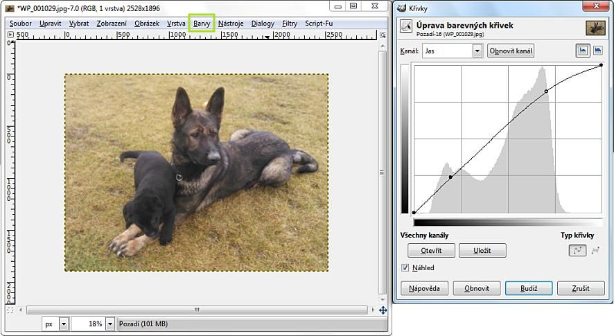 Někdy bývá obrázek přespříliš tmavý anebo naopak světlý, toto nejlépe napravíme pomocí barevných křivek - v horním menu: Barvy -> Křivky.
