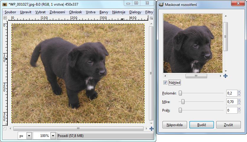 Defaultní nastavení poloměru a míry není vhodné, doporučuji přenastavit na hodnoty přiměřené velikosti obrázku, na nějž se aplikují. Pro tuto velikost obrázku mám vyzkoušeno toto nastavení: