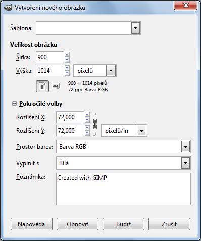 V kostce: buď můžeme předpřipravit všechny potřebné obrázky (v tomto příkladu šest) a teprve poté je "nasázet" do nového prázdného obrázku vypočítaných rozměrů anebo můžeme do něj přidávat ihned každý, který si upravíme před vložením. Nové plátno připravené pojmout oněch šest obrázků vytvoříme: Soubor -> Nový... (anebo Ctrl+N). Nezapomeneme rozbalit Pokročilé volby kvůli nastavení rozlišení: