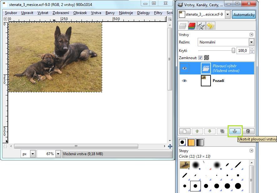 Nyní je nezbytné jej tzv. ukotvit: Plovoucí výběr (vložená vrstva) musí být modře podbarveno a nyní stačí kliknout na zeleně orámovaný obrázek kotvičky.