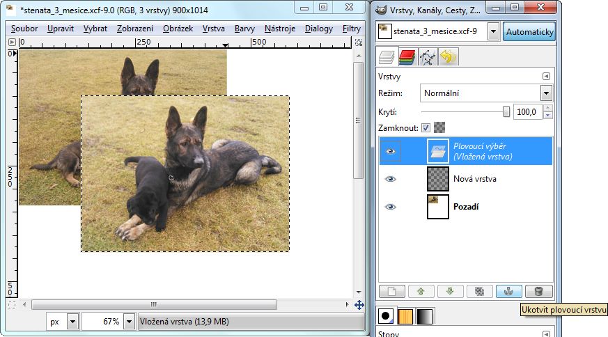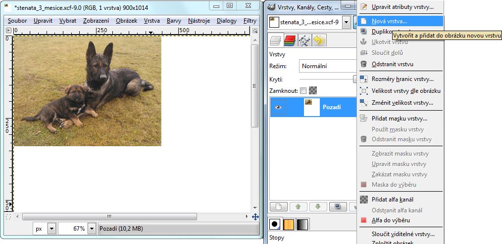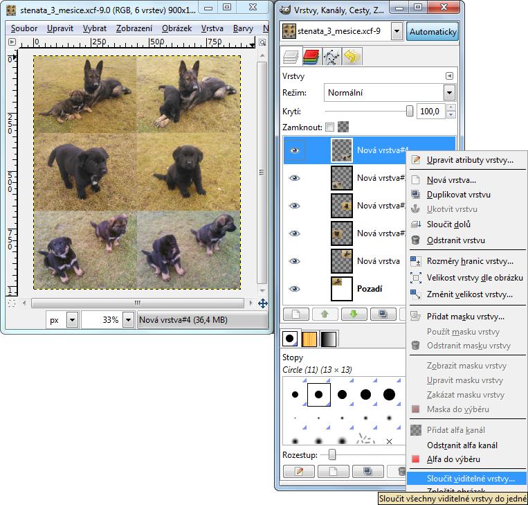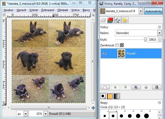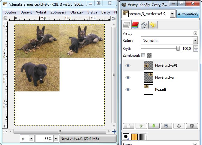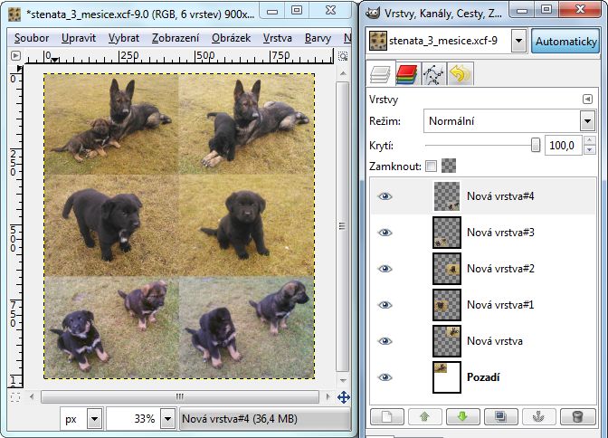 Jednou z možností je spojit více obrázků do jednoho a tento jako celek prezentovat jakožto psího čekatele na nového pánečka. Využívám k tomu program GIMP, který umí práci s vrstvami. Nabízejí se dva způsoby, jak v GIMPu vložit více obrázků do jednoho:
