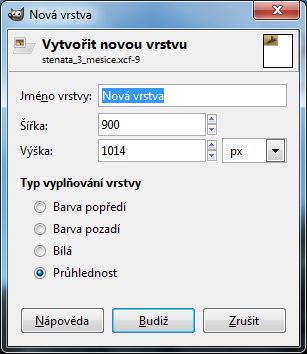 Nyní opět buď napevno "vlepíme" obrázek na plátno anebo přidáme novou PRŮHLEDNOU vrstvu kliknutím pravým tlačítkem myši na modře podbarvenou vrstvu s defaultním názvem Pozadí. Přednastavené rozměry neměníme.
