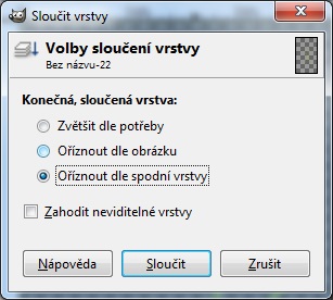 Jakmile máme všechny zamýšlené obrázky naskládány na plátně, musíme je pro použití na webu nebo i tisk tzv. sloučit. Je to z toho důvodu, že nativní formát GIMPu - přípona XCF (navíc ve více vrstvách) - není zobrazitelná ve webových prohlížečích, ani v běžných prohlížečích obrázků. Sloučení provedeme jednoduše tak, že klikneme na kteroukoli vrstvu (z našich šesti) pravým tlačítkem myši a vybereme Sloučit viditelné vrstvy. Vybereme možnost Oříznout dle spodní vrstvy, což je vlastně nastavená velikost plátna, kam jsme vkládali všechny obrázky.