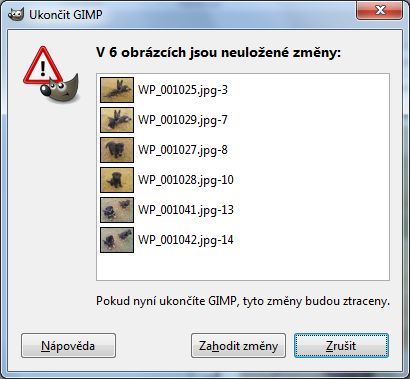 Pokud jsme jednotlivé vkládané snímky po úpravách (ořezy, úpravy barevných křivek apod.) neukládali, zobrazí se nám následně okno s varováním, že tyto obrázky nejsou uloženy. Nemáme-li v úmyslu jednotlivé zdrojové obrázky ukládat, zvolíme Zahodit změny.