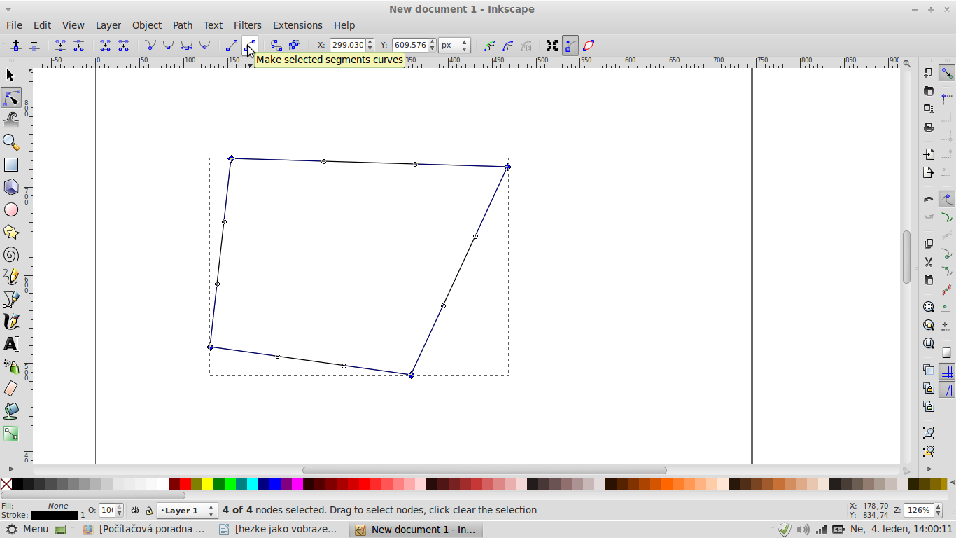 Nakliknem si z uzlových bodů (to jsou ty kroužky v rozích čtyřúhelníku) křivky, aby se nám ty úsečky, co tvoří čtyřúhelník, proměnily na křivky.