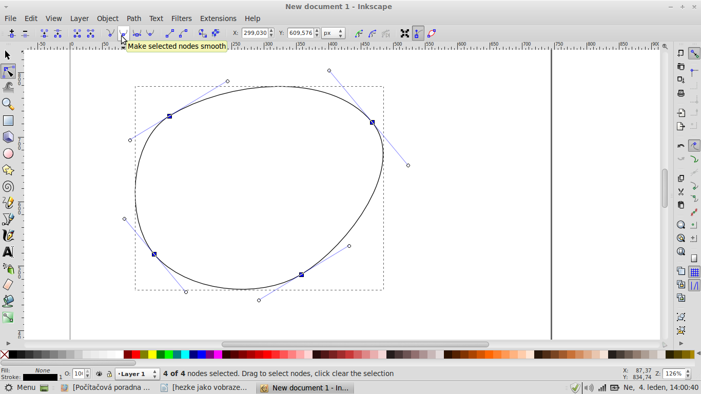 Jak se po stranách každého uzlového bodu objeví pomocné body, máme na světě křivky. Pomocí pomocných bodů můžeme tahat „směr“ a „sílu“ křivky od daného uzlového bodu. Směr je myslím jasný, síla zjednodušeně značí, jak moc se bude křivka kroutit. Já jsem si v příkladu práci zjednodušil tak, že jsem všechny uzlové body označil jako hladké, takže se mi vytvořila taková nějaká brambora.