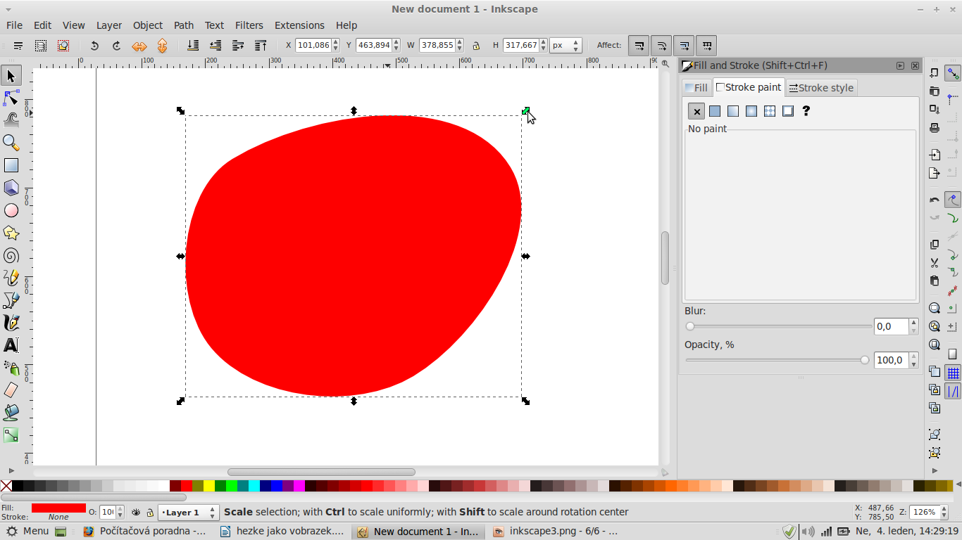 Abychom byli úplně féroví, zlikvidujeme barvu obrysu a dáme tomu nějakou výplň, abychom objekt vůbec viděli. Přepneme na výběr a transformace a lapíme tu bramboru v některém z rohů, za tu šikmou šipku (v případě Inkscape a pro naše účely zároveň musíme držet stlačený Ctrl).