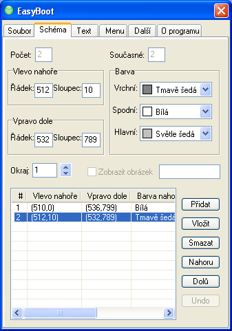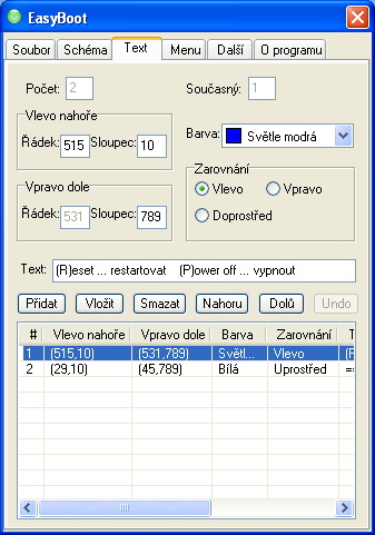 Program používá pojem „řádek“ a „sloupec“ ve smyslu y a x souřadnice na obrazovce.