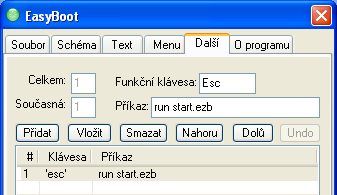 Na záložce Další máme možnost definovat funkční klávesu a přiřadit k ní příkaz. Chová se to obdobně jako klasická položka v menu. Můžeme tedy nastavit klávesu Escape a příkaz pro návrat do hlavního menu je vlastně volání tohoto menu, tj. run start.ezb