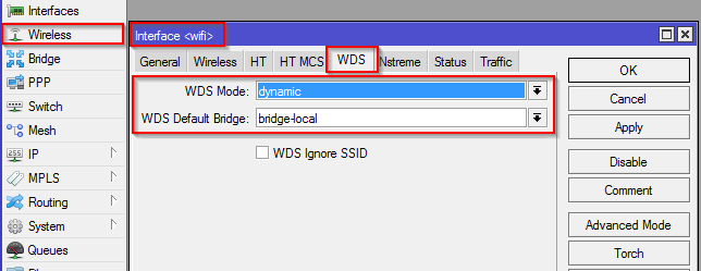 Vlastní konfigurace je velmi jednoduchá. Na hlavním routeru v menu Wireless rozklikněte WLAN interface a na záložce WDS nastavte WDS mode na hodnotu dynamic a WDS default bridge na bridge-local (výchozí existující most).