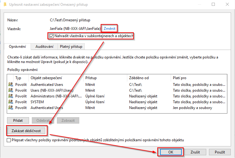1. Změna vlastnictví složky, pokud již nejsem vlastník (složku jsem nevytvořil). Pro nastavování práv stačí, pokud na objektu mám oprávnění pro plný přístup. Ale převzetí vlastnictví mi zaručí, že budu schopný práva nastavit i v okamžiku, kdy práva nemám.