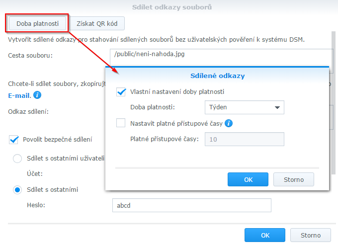 1. Možnost omezit stažení pouze na uživatele vašeho NAS serveru nebo sdílet s ostatními a zabezpečit heslem.