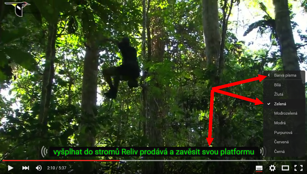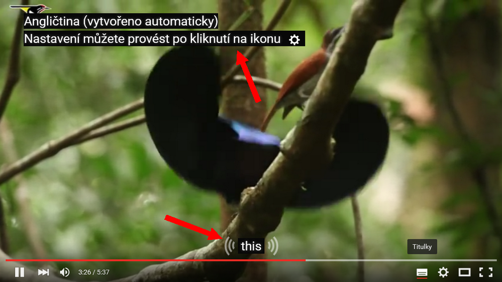 1) Pokud je video na Youtube (ale bývá to i jinde) titulky opatřeno, objeví se na liště přehrávače ikona na jejich spuštění.
