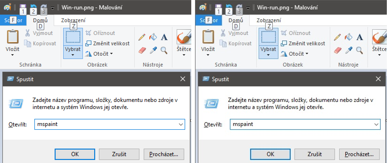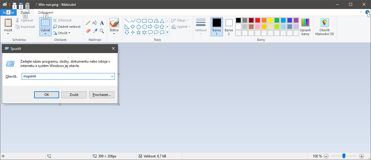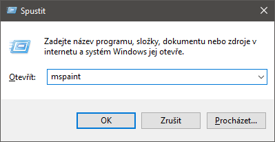 Nejprve musíme Malování spustit. Nabízí se několik způsobů, např. nalezení ikony v nabídce start, ale zdaleka nejrychlejší postup je stlačení klávesové zkratky Win + R, která otevře okno "spustit" a v něm napíšeme pouze "mspaint" (bez úvozovek) a odklepneme Enterem. Tento postup má ještě jednu velkou výhodu, funguje na všech jazykových mutacích, nemusíte tedy pátrat po tom, jak se malování jmenuje např. v německých Windows.