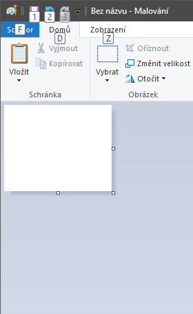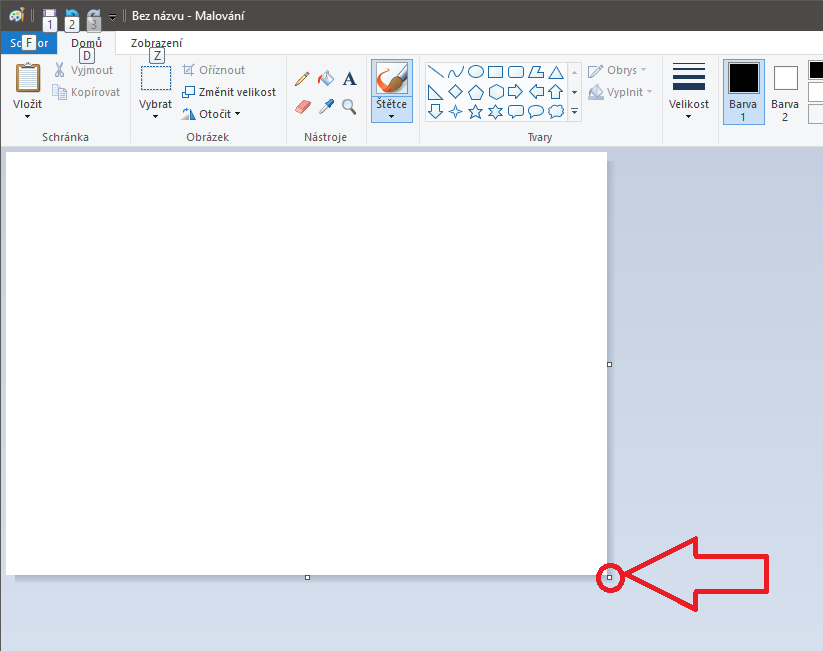 Poté, co se objeví okno Malování, doporučuji provést ještě jeden krok - úpravu velikosti plátna. Platí to zejména pro práci s menšími obrázky, např. fotkou okna aplikace. Ve výchozím stavu je totiž plátno Malování relativně velké a pokud do něj vložíme menší obrázek, zůstane nám okolo bílá plocha, které je pak dosti obtížné se zbavit. Z tohoto důvodu doporučuji před vložením obrázku ze schránky plátno pomocí označeného prvku zmenšit na rozumně malý rozměr. Uchopte roh plátna za označený roh a táhněte k levému hornímu rohu. Výsledek je na dalším obrázku.