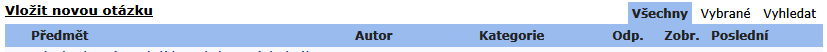 Níže je zaškrtávací seznam pro volbu kategorií. Pokud jsou zaškrtnuty jen některé kategorie, kliknutím na Vybrat se objeví v seznamu otázek jen ty ze zvolených kategorií. Kliknutím na Všechny jsou vybrány všechny kategorie.