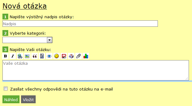 Nový dotaz založíte kliknutím odkaz "Vložit" novou otázku vlevo nahoře. Objeví se editační okno, jeho možnosti jsou pro registrované a neregistrované uživatele odlišné.