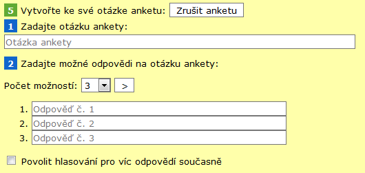Zadejte otázku ankety, zvolte z rozevíracího seznamu počet možných odpovědí (2-15, defaultně 3), vyplňte jednotlivé odpovědi a případně povolte možnost hlasovat pro více odpovědí současně. Součástí vašeho dotazu pak bude anketa, kde ostatní uživatelé budou moci hlasovat.