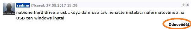 Reakce na původní otázku je hierarchicky řazena. Pokud chcete reagovat přímo na úvodní dotaz, zvolte "Odpovědět" bezprostředně za ním. Pokud chcete reagovat následně na něčí reakci, klikněte na "Odpovědět" u jeho reakce, viz příklad (zakroužkováno):