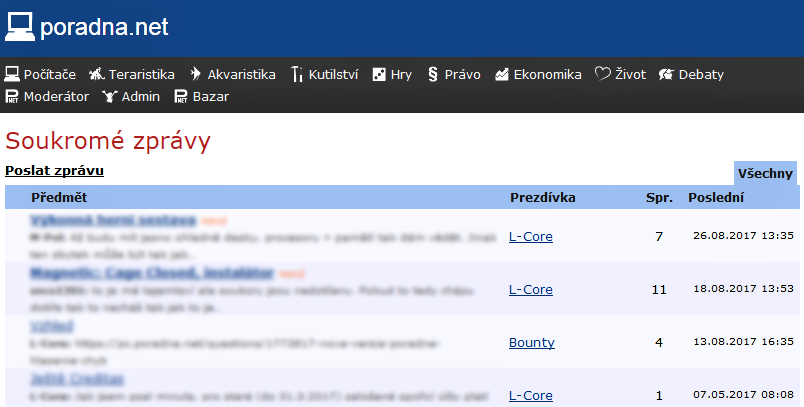 Registrovaní uživatelé mohou s ostatními registrovanými komunikovat formou soukromých zpráv (SZ, PM). Po kliknutí na "Pošta" se dostanete do seznamu všech odeslaných a přijatých zpráv, viz obrázek: