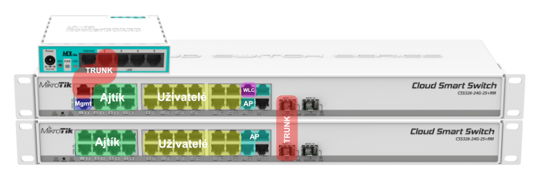 Nyní sestavíme kostru sítě. Tou budou switche a router. Protože tyto komponenty budou součástí všech sítí, musí být členy všech VLAN. Toho docílíme tím, že použijeme vzájemné propojení pomocí Trunkportů, které budou obsahovat všechny VLANy. V našem případě využijeme pro propoj switchů optických modulů v portech 25 switchů a propoj s routerem pomocí portu č.1 switche A. Router připojíme pomocí LAN portu, na kterém také nastavíme totožný Trunk. Protože nastavujeme čistý trunk, nemusíme řešit PVID. Tím je kostra hotova.
