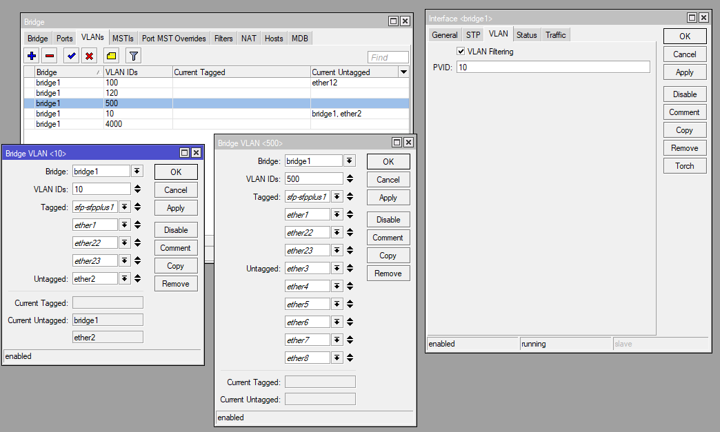 add bridge=bridge1 tagged=sfp-sfpplus1,ether1,ether22,ether23 untagged=ether2 vlan-ids=10