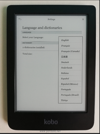 • U čtečky KOBO CLARA HD neočekávejte české rozhraní, bohužel hodně výrobců e-Book čteček na češtinu stále zapomíná. Při prvním spuštění čtečky při základním nastavení, kde v prvním kroku si volíte jazyk rozhraní čtečky jako :