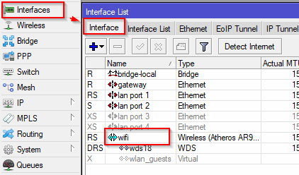 To najdeme pod Interfaces na první záložce - rozhraní označené jako Wireless. Obvykle bude pojmenované jako wlan1 (u mne je to wifi). V dalších příkladech budu pracovat s výchozím názvem wlan1.