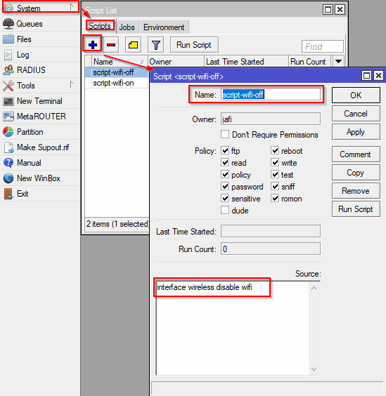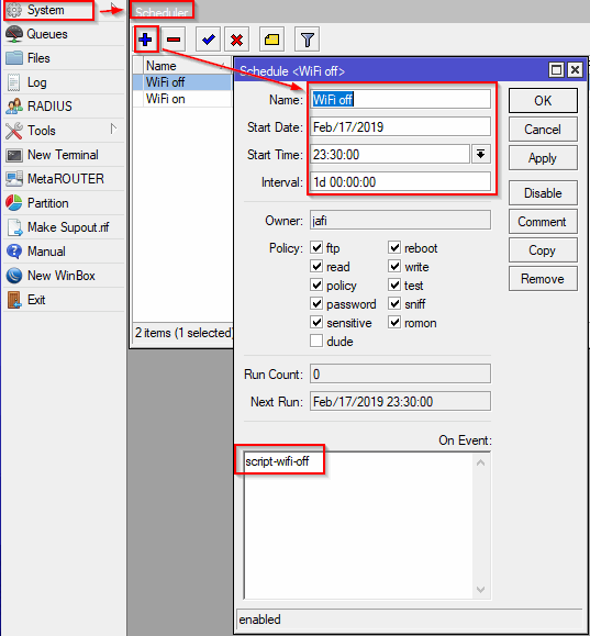 MikroTik jako SOHO router - 6 - plánované zapnutí/vypnutí WiFi