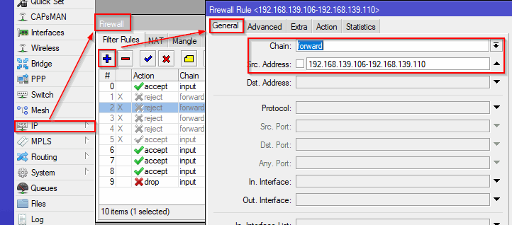 Pravidla nastavujeme v menu IP / Firewall na záložce Filter rules. Po vytvoření pravidla umístíme někam před poslední pravidlo DROP, které zahazuje vše, co neprojde předchozími pravidly.
