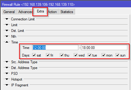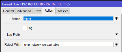 Action - nastavíme, co se v době platnosti pravidla bude dít. Pro zamezení jsem použil REJECT s důvodem, že síť je nedostupná. Je možné použít i prosté DROP.