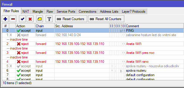 Já (jako pán firewallu) jsem se rozhodl, že WiFi bude dostupná od 6:00 - 12:00 a 18:00-23:00. Pomocí pravidel si můžete nastavit jiný rozsah v pracovní dny a jiný o víkendu.
