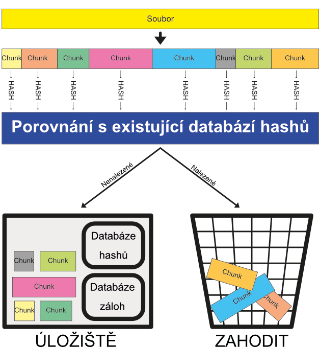 - Pokud je hash nalezen, je chunk zahozen. Pokud nalezen není, je chunk odeslán na server do zálohy