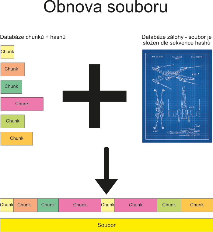 - Sekvence hashů odpovídající chunkům ze souboru je zavedena do zálohy jako reprezentace zálohovaného souboru