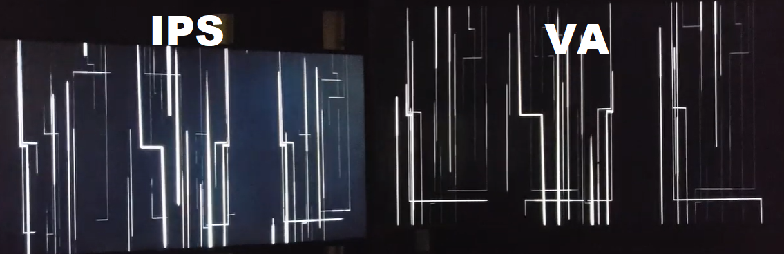 VA ma podstatně lepší hloubku černé což jde vidět hlavně v tmavých scénách a podobně, IPS je v tom technicky omezenější. Hodně uživatelů si stěžuje na únik světla.