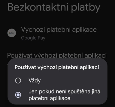 Výchozí platební aplikace je Google Pay a v následujícím nastavení je, že telefon používá pouze výchozí aplikaci.