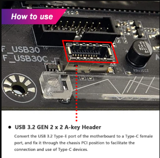 ♦ Díky tomuto portu USB typ E mužete rozšířit vaše PC o ruzné komunikační porty, ruzna zařízení, portu, které můžete připojit na front panel jako USB-C, dokovací stanice atd, připojeni dalšího 19PIN USB3.0, ten s modrym zobáčkem ktery zapojujete na zakladní desce pro USB 3.* port na frontalním panelu vašeho PC.