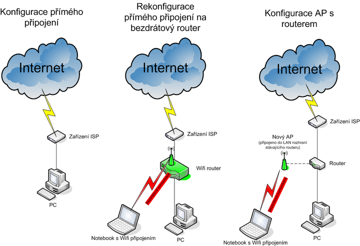 S ohledem na stav (existence nebo naopak neexistence) vaší lokální sítě (dále jen LAN) je třeba nejprve určit, jaký aktivní síťový prvek budeme potřebovat - zda prostý Access Point (zkráceně AP; česky přístupový bod) nebo Router (česky Směrovač).