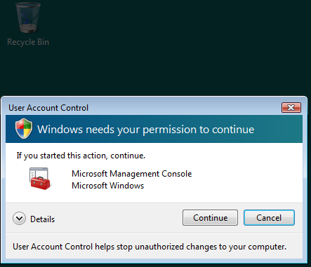 S největší pravděpodobností je toto podoba UAC, s jakou jste se již setkali. Ano, je to ona proslulá "otravná hláška". Pokud dialog potvrdíme, program se spustí pod naším účtem, stejně jako všechny programy doposud, ale dostane navíc bezpečnostní práva administrátora, čemuž UAC u normálních programů brání.