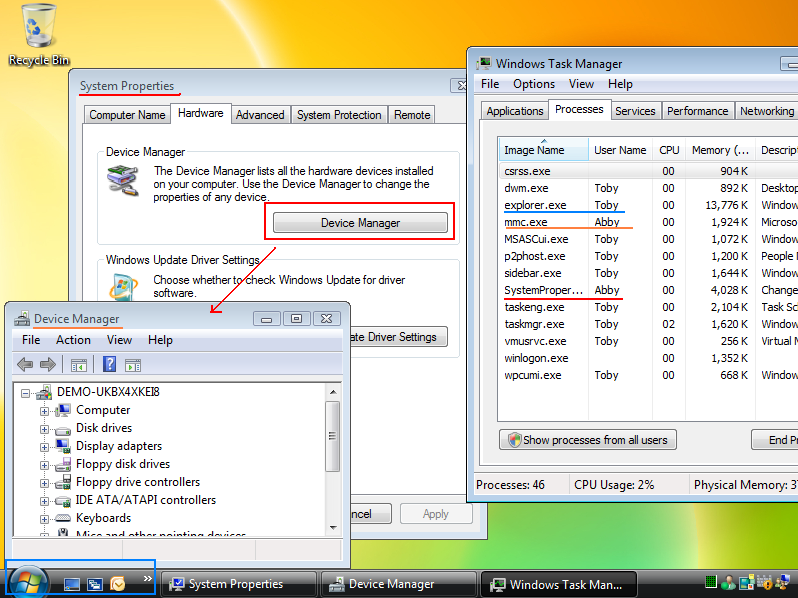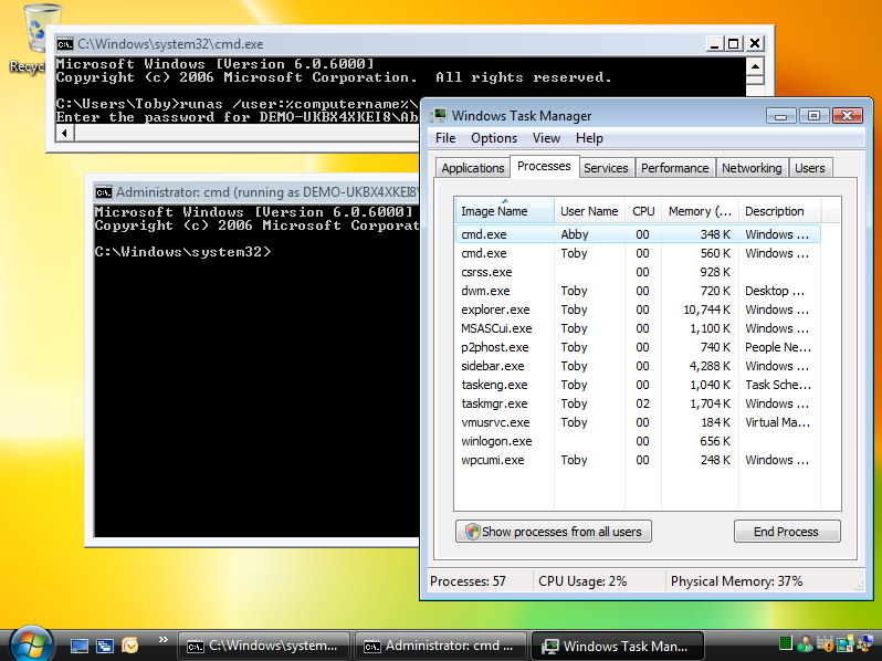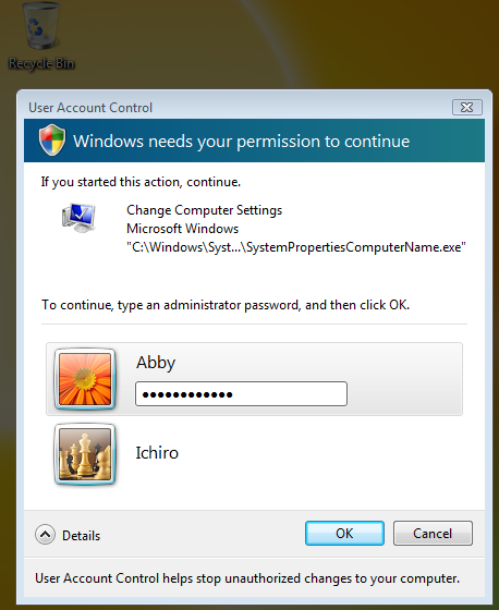 (Abby je uživatel s právy správce kterého jsme zadali do UAC dialogu, Toby s právy uživatel, který je přihlášen.)