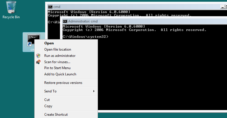 Speciální případ je přikazový řádek, NT konzole "cmd.exe". Z nějakého záhadného důvodu berou Visty aplikaci jako speciální,nejspíše protože může být přímo z něho zadán příkaz který například formátuje disk nebo dělá jinou administrátorskou akci, a tak mu jen při přímém spuštění nepřidělují administrátorská práva. Je potřeba ho vždy spustit jako správce touto volbou, pokud chceme aby měly řádkové příkazy práva správce také. (V takovém případě proženou Visty příkazový řádek UACem). Na screenshotu níže jsou dva příkazové řádky pod stejným uživatelem, jen jeden prošel UAC elevací, druhý nikoliv.